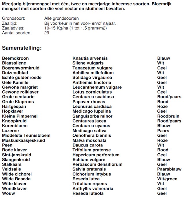 Als u wilt weten welke bloemen zijn ingezaaid, dan kunt de samenstelling van het bloemenmengsel bekijken op de website van Chalet Parket. Het mengsel is zo samengesteld dat zo veel mogelijk verdeeld over het jaar nectar aanwezig is voor de insecten. De rotonde begint steeds meer in bloei te komen. In de winter laten we meerjarige bloemen staan, zodat de insecten een overwinteringsplek hebben. Het zal tijd nodig hebben, voordat de verschillende soorten bloemen tot bloei komen.