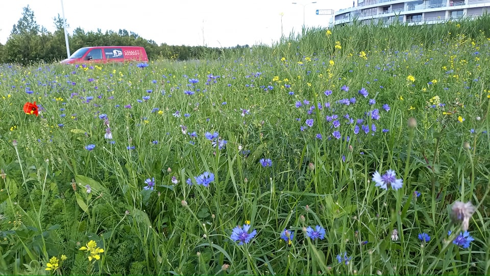 Chalet Parket heeft de rotonde Nieuwe Bennebroekerweg – Deltaweg in Hoofddorp ingezaaid met 40 verschillende soorten inheemse kleurrijke bloemen met veel nectar en stuifmeel voor o.a. vlinders, kevers, zweefvliegen en solitair levende wilde bijen en hommels.